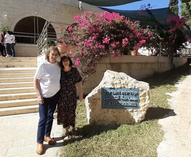 [Photo] Rennie and Dorothea pictured outside the worship centre of the Mt Carmel Messianic congregation near Haifa in Israel.
